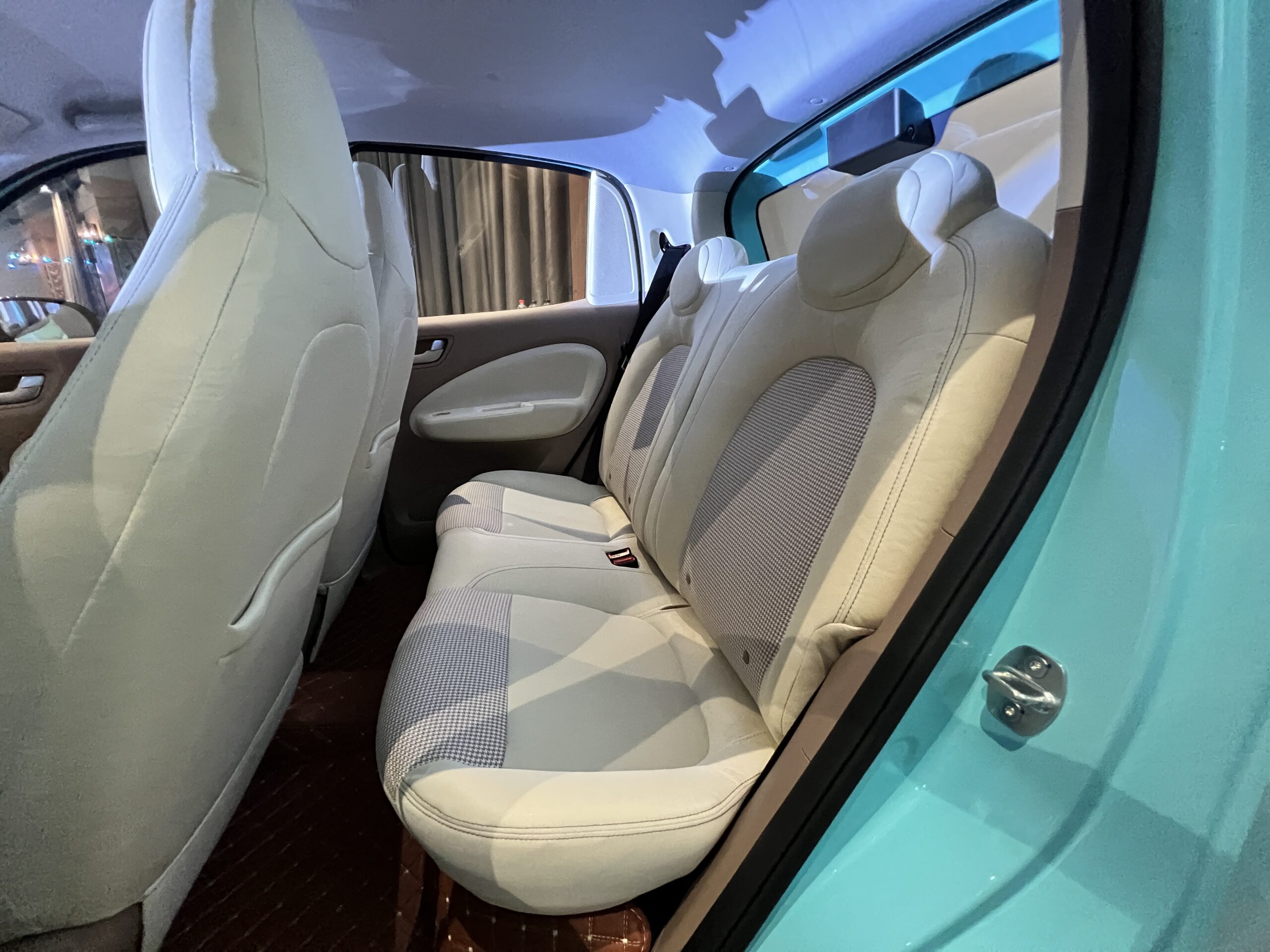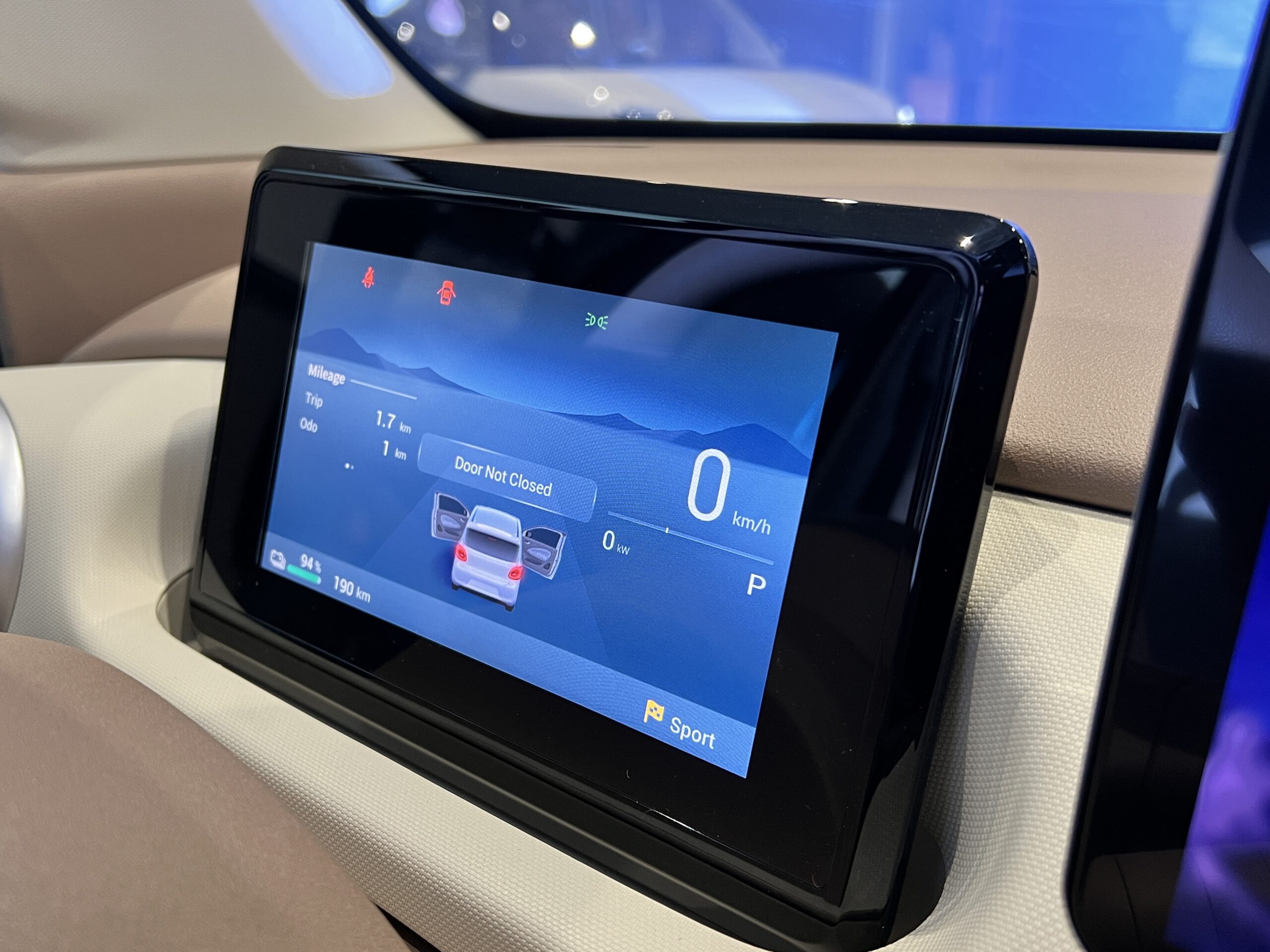 Materialele sunt dure, dar avem unele elemente de design interesante, precum gurile de ventilație și selectorul transmisiei, care amintește de prima versiune de Dacia Spring. Volanul se simte plăcut la atingere, iar acesta integrează comenzi pentru elementele media și acceptarea/respingerea de apeluri, dar doar pe partea sa dreaptă.