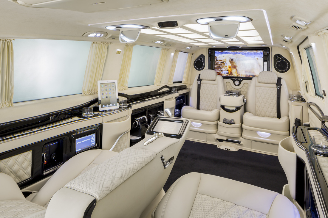 Atelierul german Klassen a creat o limuzină-birou-pe-patru-roţi bazată pe un Mercedes-Benz Viano. Şi rezultatul e cu adevărat impresionant, fiindcă în interior găsim scaune preluate de pe S-Class (aşa că poţi fi sigur că pasagerii vor călători în confort suprem), mai multe televizoare şi multă, foarte multă piele.