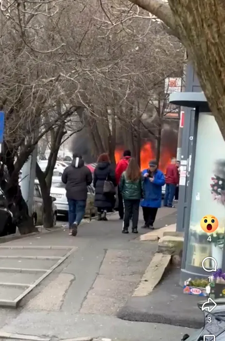Video / Primele imagini cu mașina în flăcări. Incendiu violent în București. O femeie de 51 de ani a murit, șoferul este în stare gravă după ce o mașină electrică a luat foc