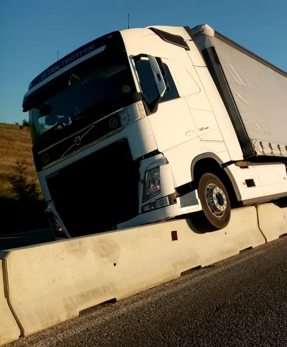 Un TIR a ajuns pe un separator de benzi din beton. S-a întâmplat pe o şosea din Gorj – FOTO