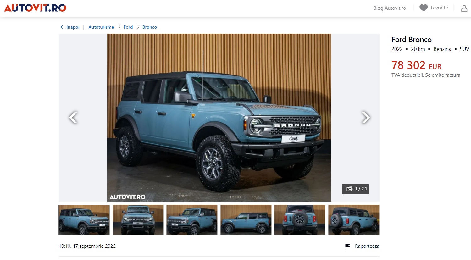 Pe Autovit.ro am găsit un anunț care se referă la vânzarea unui Ford Bronco 2.3 EcoBoost Badland Edition, nou-nouț, cu suma de 78.302 euro (TVA inclus). Mașina este disponibilă la comandă. Ford Bronco 2022 vine cu un motor pe benzină de 2.3 litri EcoBoost care produce 271 CP, tracțiune integrală și cutie de viteze manuală.