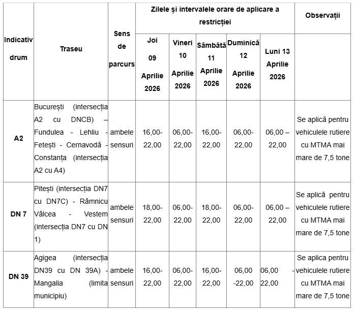 Potrivit informațiilor transmise de CNAIR, măsura este aplicată în baza Ordinului MT-MAI nr. 1249-132/2018 și vizează vehiculele rutiere cu masa totală maximă autorizată mai mare de 7,5 tone, altele decât cele destinate exclusiv transportului de persoane. Restricțiile sunt valabile în zilele de 9 aprilie, 10 aprilie, 11 aprilie, 12 aprilie și 13 aprilie 2026, adică în perioada care acoperă Vinerea Mare și primele 2 zile de Paște.