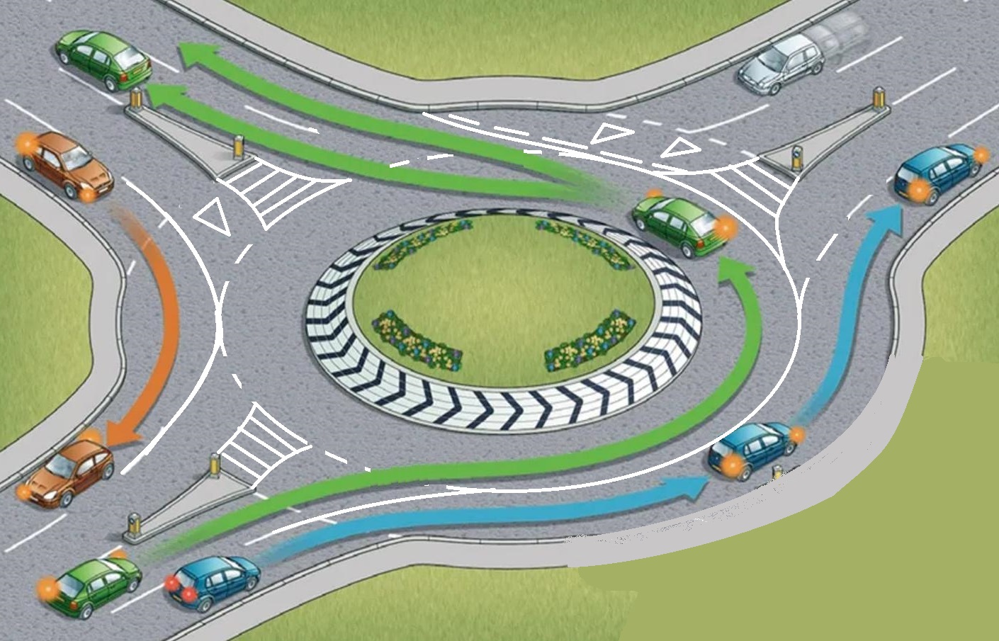 În general, când un vehicul urmează să pătrundă în intersecție, trebuie să cedeze trecerea celor care circulă deja în interiorul giratoriului.
