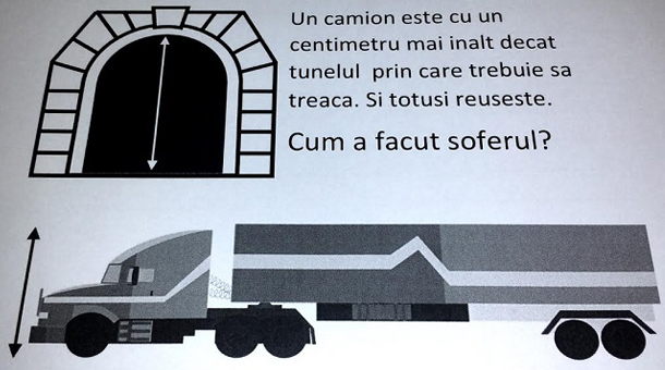 Un camion trebuie să treacă printr-un tunel, însă înălţimea lui depăşeşte cu un centimetru pe cea a tunelului. Cum va proceda şoferul?