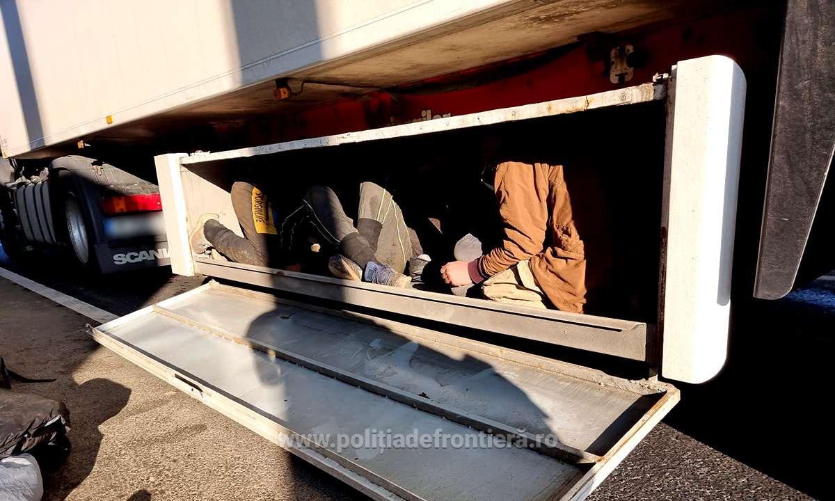În urma efectuării controlului amănunţit al mijlocului de transport, au fost descoperiţi, ascunşi în lada cu scule a semiremorcii, patru cetăţeni străini.