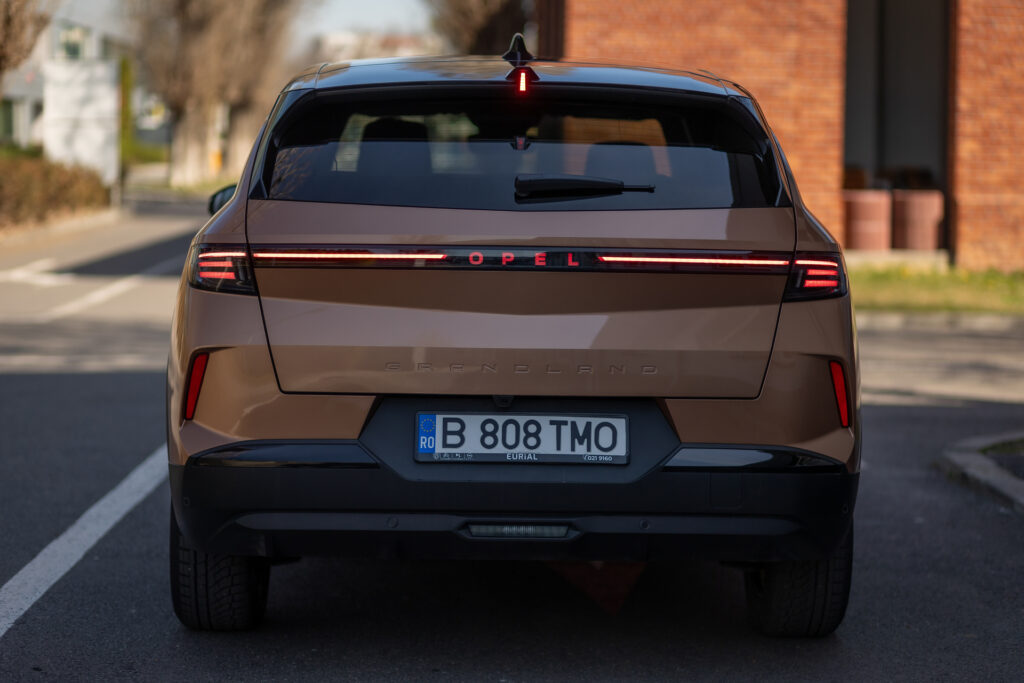 Opel a ales să păstreze un ton cuminte pentru partea din spate, cu o bandă LED ce se întinde pe toată lățimea portbagajului, însă vedem o premieră. Logo-ul a fost acum integrat în aceasta, fiind iluminat, ușor de citit pe timp de noapte. Totul este completat, în acest caz, de un plafon negru, care oferă un contrast puternic în combinație cu nuanța Cupru Impakt. Fanii Apple s-ar putea să fie mari fani ai acestei nuanțe de cupru cu accente trandafirii – Rose Gold vă sună cunoscut?