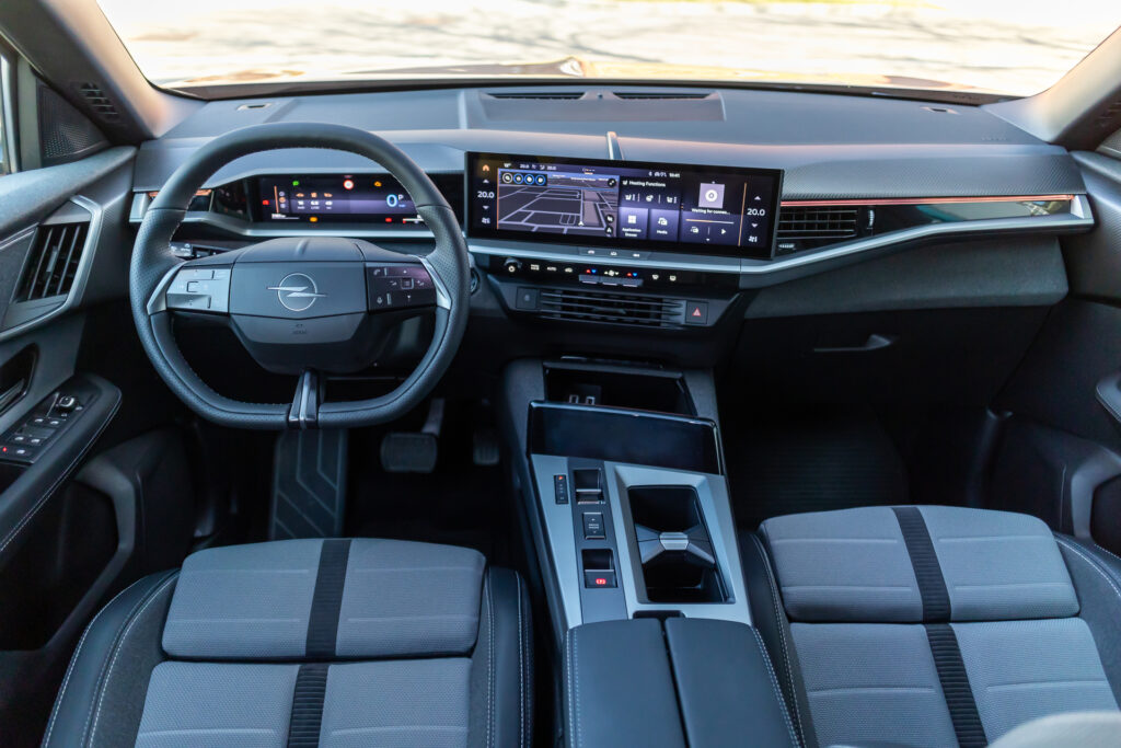 Îmi place abordarea celor de la Opel, cu un instrumentar de bord minimalist, care îți afișează doar informațiile de care ai nevoie. Opțional, mașina poate fi configurată și cu un head-up display. Apoi, avem ecranul central, foarte lat, pe care rulează un sistem familiar – nu cel mai ușor de operat – însă îmi place că este acompaniat de o serie de butoane fizice. Aleluia! Cu ajutorul acestora poți modifica temperatura, viteza ventilatorului, degivrarea parbrizului și lunetei, dar și alte funcții de care vei avea adesea nevoie.