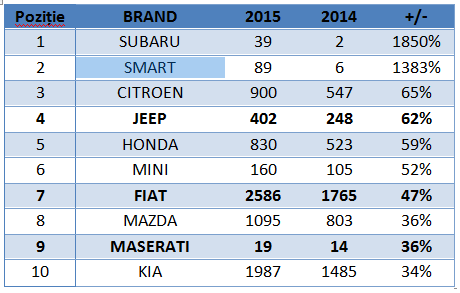 Marca Fiat a reintrat în Top 10 vânzări autoturisme în România, cu 2.586 unităţi comercializate în 2015.