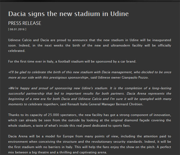 „Udinese şi Dacia anunţă că noul stadion din Udine va fi inaugurat în curând. În următoarele săptămâni va fi sărbătorită naşterea unei noi arene ultramoderne. Pentru prima dată în Italia, un stadion va fi sponsorizat de un brand auto”, se arată în comunicatul de pe site-ul grupării italiene.