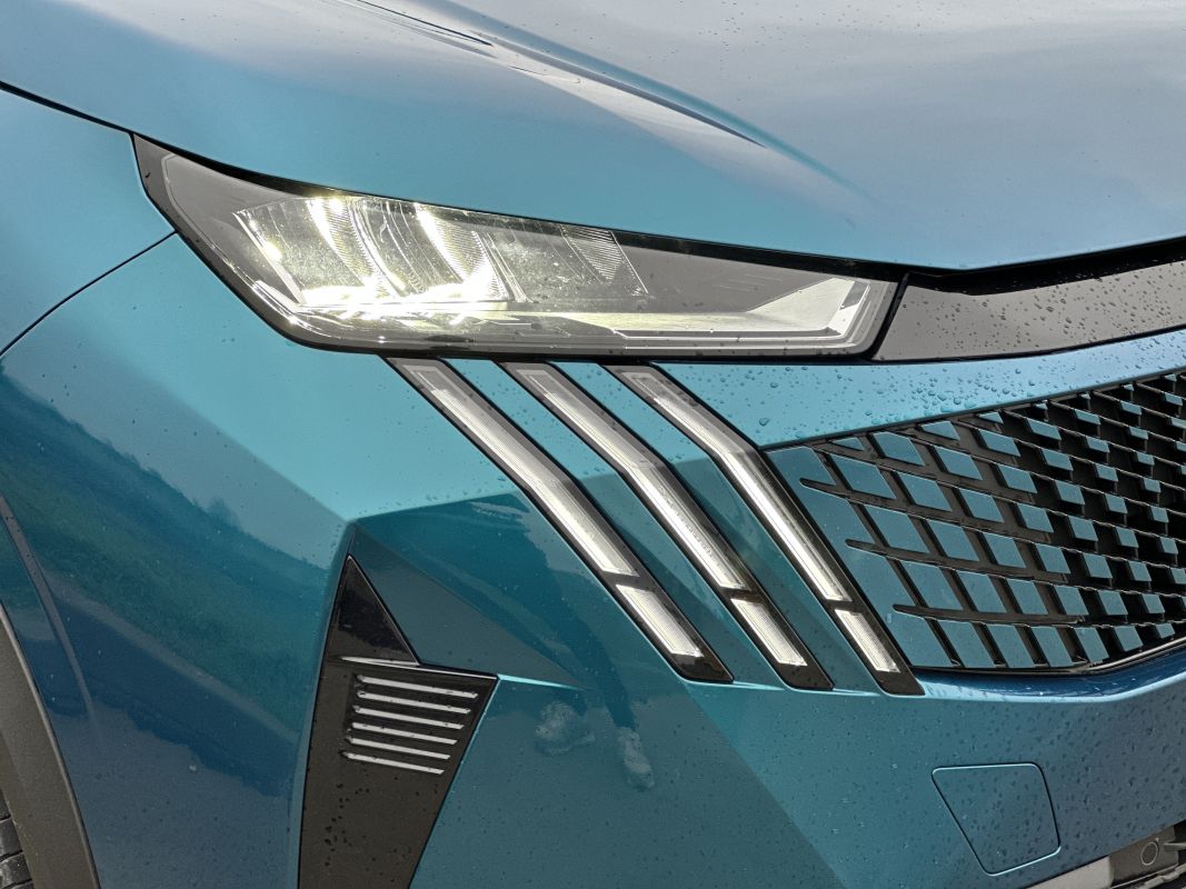 Partea frontală marchează una dintre cele mai radicale transformări. Emblema Peugeot devine elementul central al designului, iar masca este tratată ca o suprafață unitară, cu inserții în culoarea caroseriei (în culoarea Albastru Obssesion) care estompează granița dintre grilă și restul părții frontale. Farurile full LED, standard pe toate versiunile, sunt mai subțiri și mai expresive, oferind o „privire” mult mai incisivă decât în trecut. Este un design care transmite tehnologie și statut.
