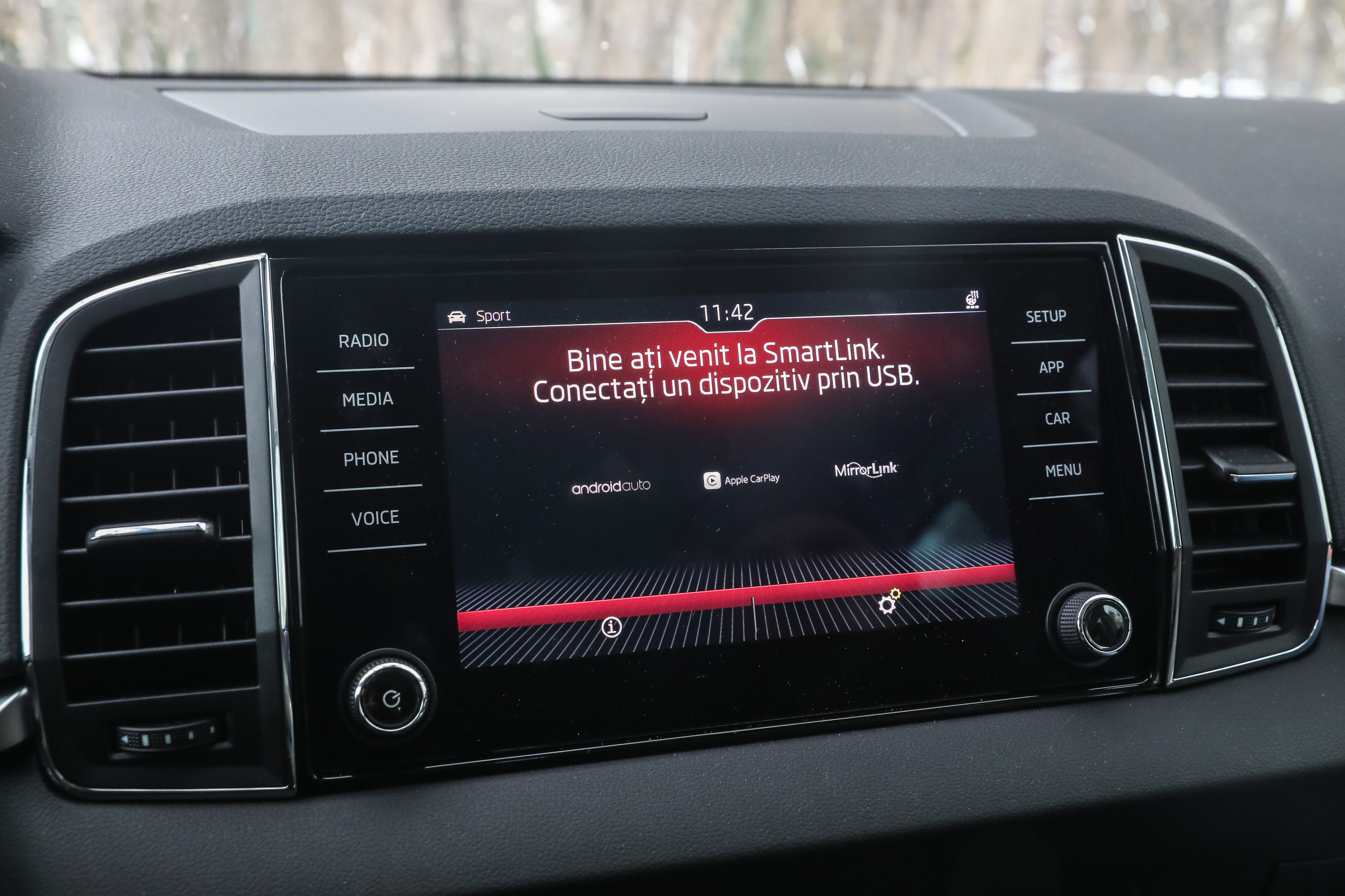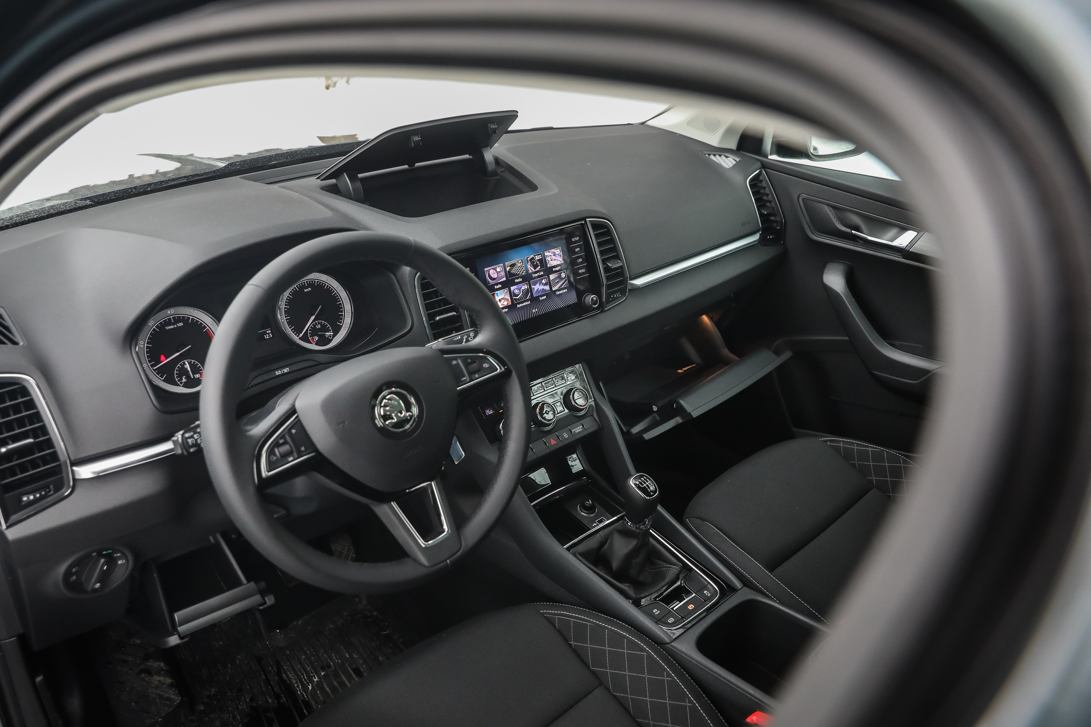 Ecranul tactil de 8 inchi al sistemului de infotainment şi plasticul lucios din partea inferioară a planşei de bord rup monotonia şi întineresc interiorul lui Karoq. Sistemul de operare se mişcă repede, este destul de intuitiv, iar scurtăturile laterale sub forma butoanele capacitative ajută şoferul.
