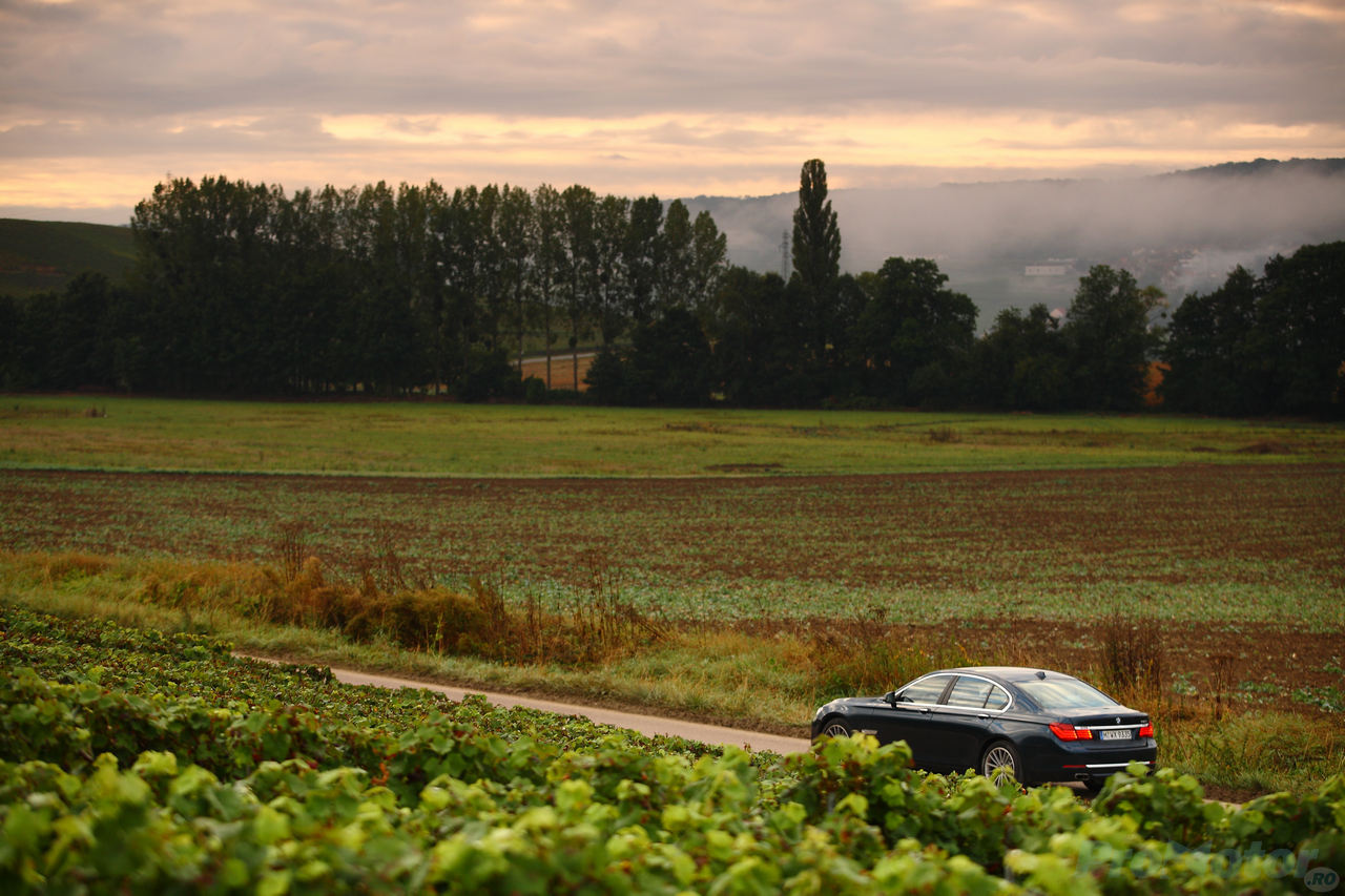 Aici am găsit în fine şi acel drum liber şi întortocheat pe care am putut să dezlănţui toată bucuria ingineriei germane de sub caroseria Seriei 7. Şi-uite aşa, printre dealurile pline de viţă de vie pregătită pentru şampanie, am gonit ca un nebun, sub pretextul ultimei şedinţe foto, realizată chiar în vii. Urletul evacuării, sprinturile de la 0-100 în sub 5 secunde, virajele luate incredibil de sport pentru o limuzină, dar mai ales eleganţa extremă a acestei maşini eliberate deodată de toate complexele mi-au adus aminte încă o dată, dacă mai era nevoie, că şi francezii i-au invadat pe nemţi, şi nu o dată. De fapt, cele două popoare sunt mai înfrăţite decât ar crede!